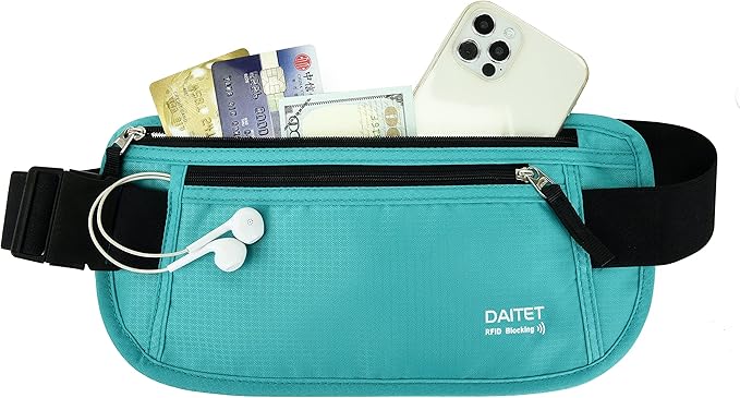 RFID Blocking Money Belt for Men Women, Slim Fanny Pack for Travel,Running,Conceal Waist Wallet for Passport Holder,Phone,Cash(Black Mint Green)