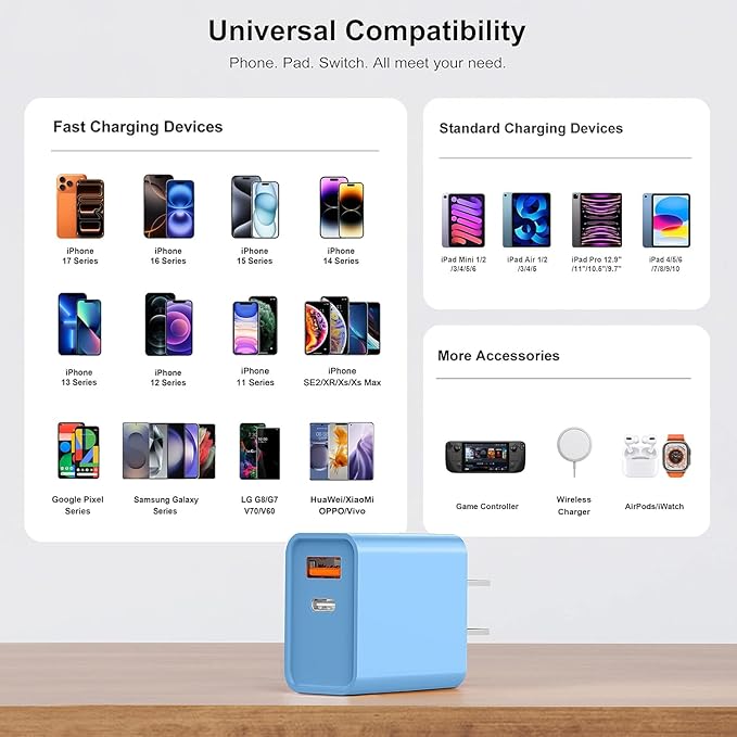 - 3 Pack Dual Port Charger: Compatible for iPhone 17/17 Pro/17 Pro Max/16/16 Pro/16 Pro Max/16 Plus/15/15 Pro/ 15 Pro Max/15 Plus/14/14 Plus/14 Pro/14 Pro Max/13/13 Pro Max/13 Pro. Block two in one - USB-A and USB-C ports to charge two devices simultaneously at high speed. Minimize waiting time and frees you from messy chargers with various interfaces