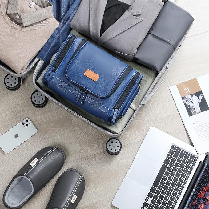 MIRASON Hanging Toiletry Bag for Men PVC Leather Dopp Kit Waterproof Travel Organizer Bag with Sturdy Metal Hook and Handle for Bathroom Shower Cosmetics Camping Brushes Shaving (Blue)