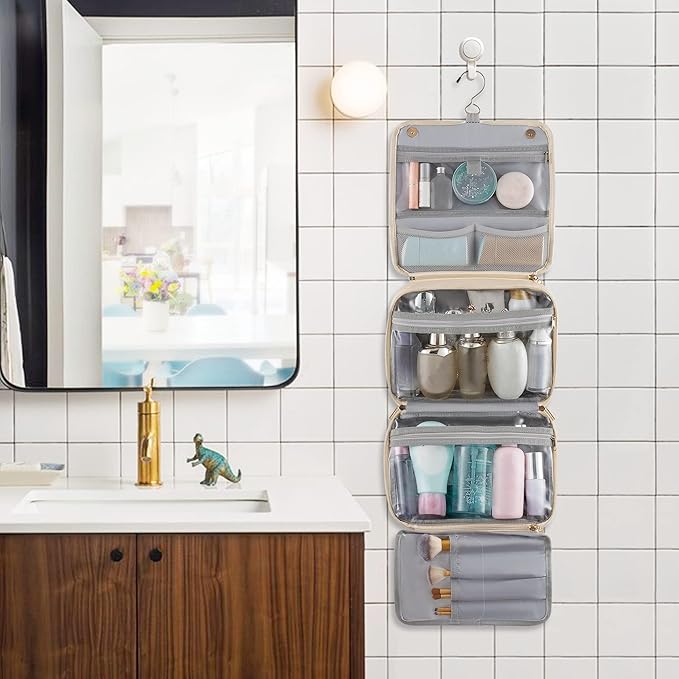 Elviros Hanging Travel Toiletry Bag for Women,3-in-1 Large Makeup Bag and Cosmetic Organizer,Vegan Leather Waterproof Skincare Case for Travel Size Toiletries and Accessories,Gift for Women