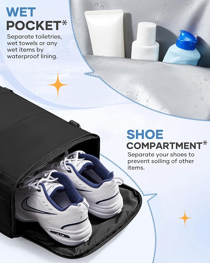- 【SEPARATE SHOES COMPARTMENT AND WET POCKET】 The shoes compartment can hold a pair of slippers or low-top sneakers, allowing you to switch freely in different states of travel, business trips and outdoor sports; the wet pocket is made of high-density waterproof material, which can be used with to store wet items, making your stay in a hotel or apartment more convenient