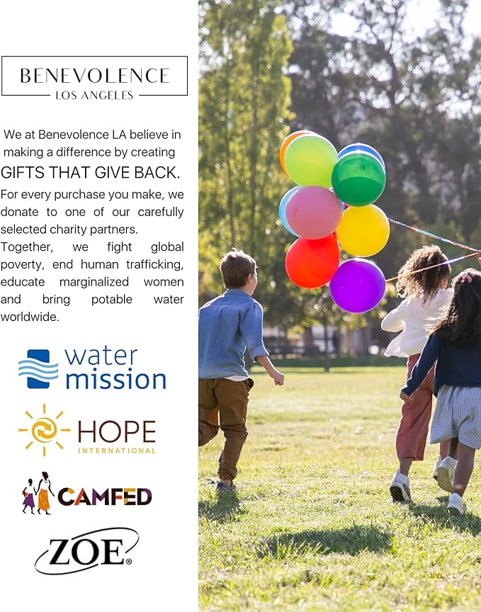 - GIFTS THAT GIVE BACK: We at Benevolence LA, believe in making gifts that give back. For every purchase you make, we donate to one of our carefully selected charity partners. Together, we make a difference.