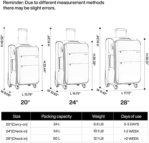 - 【Organization Made Easy】This 20+24+28inch suitcase luggage dimensions is:13.78*9.06*22.44",34L,8.8lb(20inch),15.75*10.63*26.38",54L,10.1lb(24inch)17.72*11.42*30.31",80L,12.1lb(28inch),The large-capacity multi-compartment design with a spacious main compartment and a front multi-zone convenient opening makes it easy to keep your items organized. Say goodbye to messy luggage and hello to a stress-free travel experience.