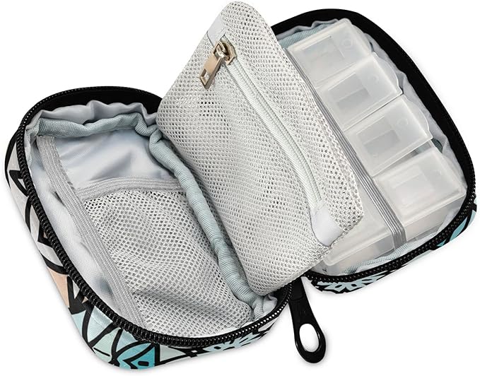 - Weekly Pill Organizer:Soft cloth pill case with zipper, one front pocket for card, Inside one plastic pill box with 8 compartments(BPA free) + one mesh bag with zipper + 2 mesh pockets, enough to hold vitamins ,pill supplements and medicine bottles medication weekly