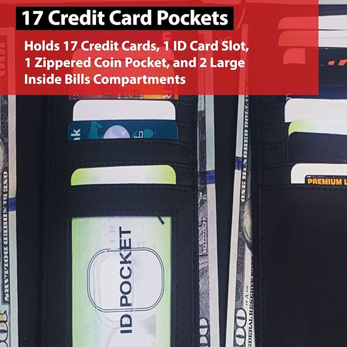 - DIMENSIONS: 7" x 3.5" (FOLDED), 7" x 11" (UNFOLDED). Features 17 credit card slots and 1 clear ID window, offering ample storage and easy access in this men’s tri-fold biker chain wallet. This motorcycle wallet that fits easily into any pant pocket. Features secure double snap closure and a spacious currency compartment to keep your cash safe. Includes a convenient zipper pocket for coins, making it ideal for everyday use without adding bulk.