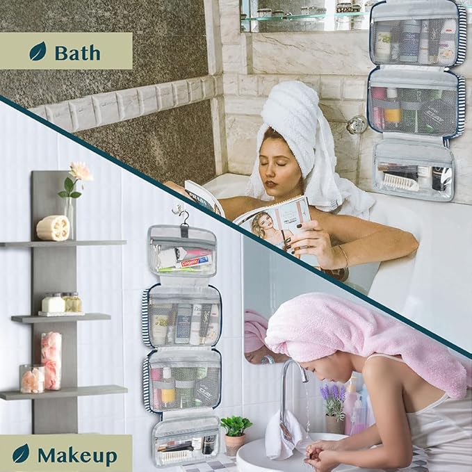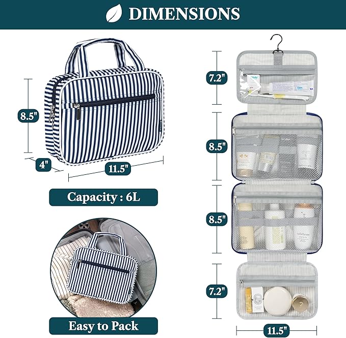- HANGING COSMETICS TRAVEL BAG ORGANIZER: This toiletry bag for women has a hanging hook and multiple pockets that help you stay organizer during business trip, vacation travel. The hanging hook makes it easy to hang the toiletry bag to bars in the hotel shower bathroom. Unzip your toiletry bag to reveal compartments to organize your shampoo, skincare face hygiene products. This toiletry travel bag is an essential accessory for cruise in Europe, plane, Hawaii Trip, and honeymoon.