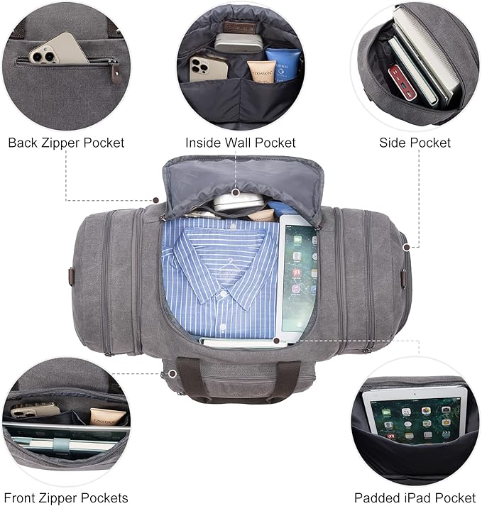 - 【Spacious with Multiple Pockets】: This large-capacity duffle bag for men features multiple functional compartments and pockets, including a padded iPad compartment and an anti-theft pocket. It's capable of holding 3 to 5 days' worth of essentials, such as clothing, shoes, water bottles, a laptop, and an iPad. Additionally, it comes with a complimentary toiletry bag to conveniently organize your personal care items.