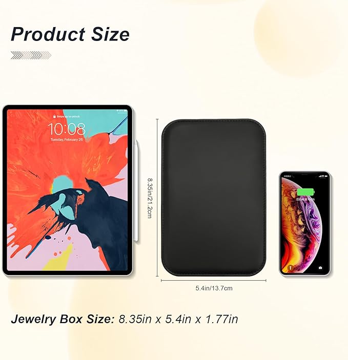 - TRAVEL JEWELRY CASE - Small jewelry box is lightweight and portable: 8.35" x 5.4" x 1.86". It is easy to carry in your handbag or luggage and keeps all your jewelry well organized. It is convenient for journeys, travel, weekend trip, or business trip.