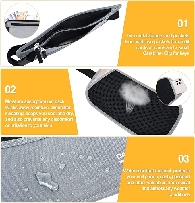- Water Resistant : Water resistant material protect your phone,cash ,passport holder ect and other valuables safe and dry from sweat and almost any weather condition ( (not fully waterproof).