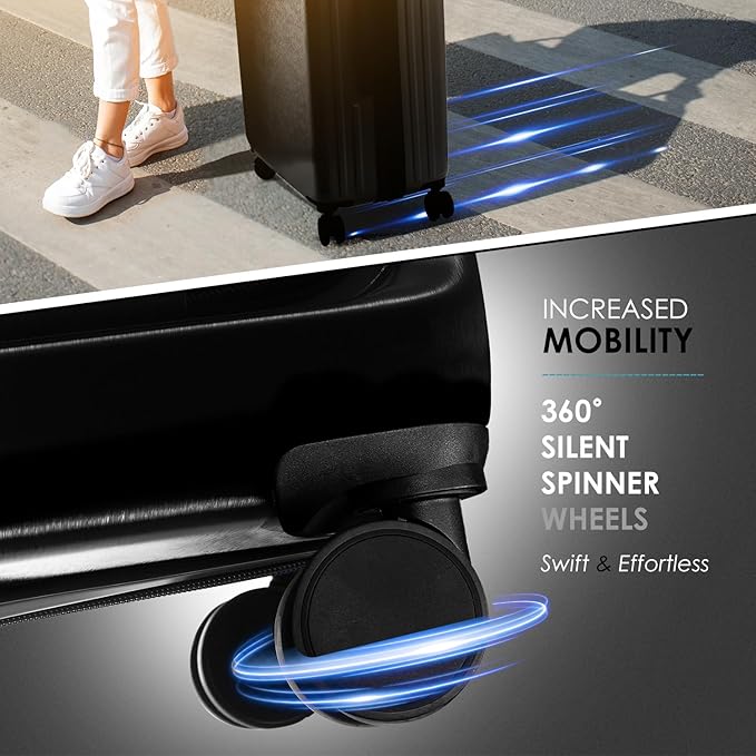 - Carryon Luggage with Spinner Wheels: Rolling carry on luggage for plane travel includes 4 spinner wheels that provide you with smooth, gliding 360 movement, a telescoping handle, stainless steel name tags, and TSA lock to secure your belongings.