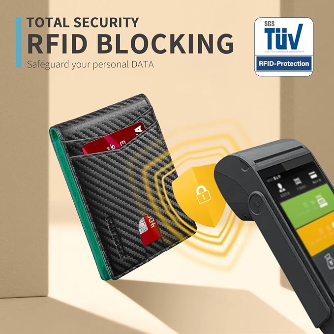 - RFID Blocking - Our wallets are equipped with advanced RFID SECURE Technology, a unique metal composite, engineered specifically to block 13.56 MHz or higher RFID signals and protect the valuable information stored on RFID chips from unauthorized scans. License and ID cards will be protected effectively. Blocking the 13.56 MHz band and protect against data theft by RFID scanners