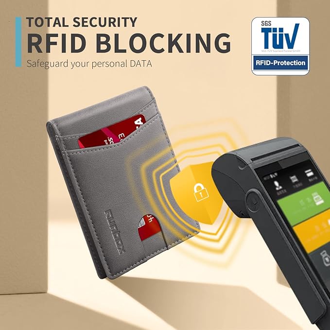 - RFID Blocking - Our wallets are equipped with advanced RFID SECURE Technology, a unique metal composite, engineered specifically to block 13.56 MHz or higher RFID signals and protect the valuable information stored on RFID chips from unauthorized scans. License and ID cards will be protected effectively. Blocking the 13.56 MHz band and protect against data theft by RFID scanners