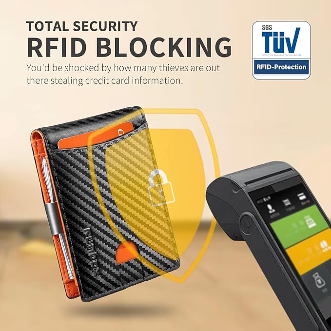 - RFID Anti-Theft SECURITY - This slim wallet for men is equipped with German Institute Certified RFID Security technology, a unique metal composite, engineered specifically to block 13.56 MHz or higher RFID signals to protect the valuable information and privacy