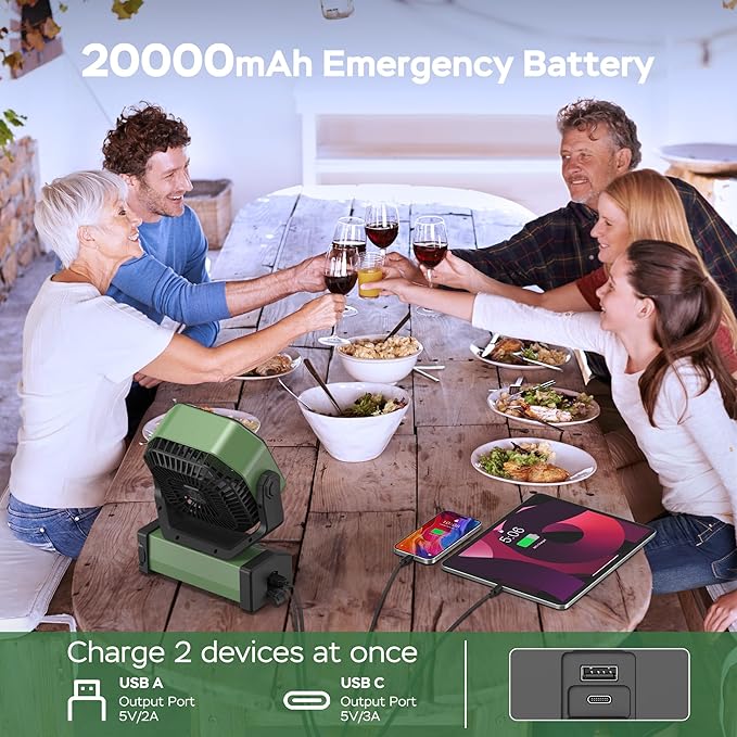 - Long-lasting Battery: The camping fan features a 20000mAh built-in battery with up to 60 hours of runtime on the lowest wind speed. Equipped with USB output ports for charging phones or other devices during power outages or outdoor adventures