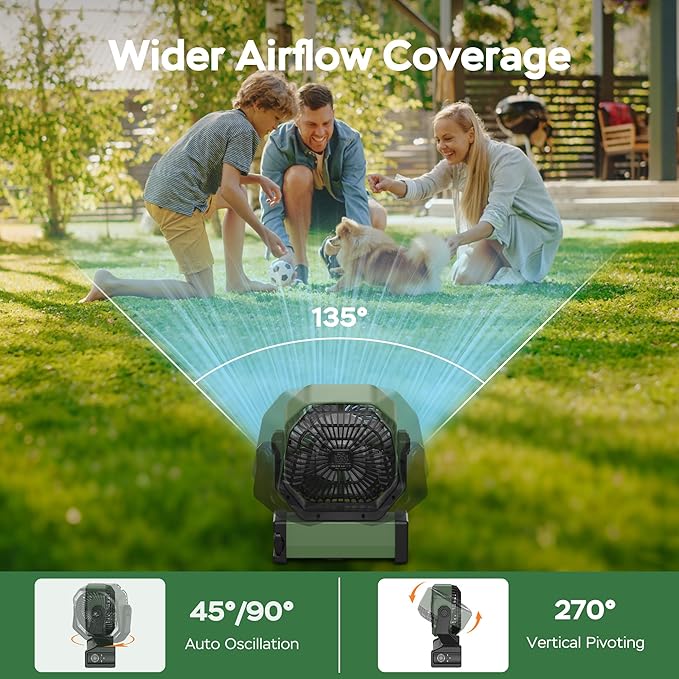 KITWLEMEN Camping Fan with Light - 20000mAh Rechargeable Battery Fan, 60Hrs Max Run Time, 4 Speeds, Timer, Auto Oscillation, 270° Pivot & Hook for Camping, Power Outage, Hurricane