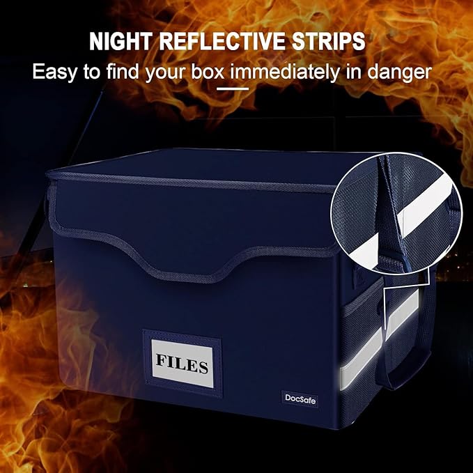- High quality, Innovative design: Fireproof document box uses different boards than other box,High quality PP boards won't warp and it can hold a minimum of 150 lbs. The Non-dusty material can prevent dust from sticking to the outside of our fireproof box, always keep it neat and tidy. The reflective strip design on the side of the box allows you to immediately find your fireproof box even at night, protecting irreplaceable documents and valuables from fire.