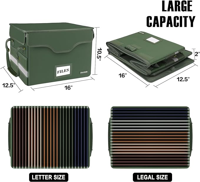 DocSafe Fireproof Document Box with Lock,File Storage Organizer with Pockets,Collapsible Portable File Box Home Office Safe Filing Cabinet with Handle for Hanging Letter/Legal Folders,Green,2 Pack