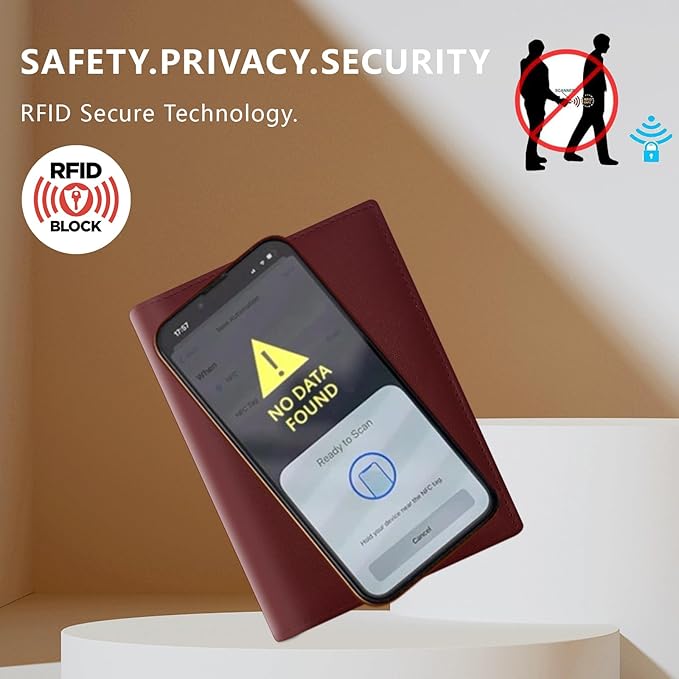 - RFID Blocking: Passport wallet with inside RFID blocking shield material helps prevent personal account information disclosure.the Rfid blocking shield is made of a metal composite, it would not trigger the airport scanner.Make your journey more secure and enjoyable.