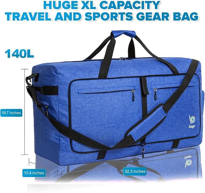 Bago Big XXL Foldable Duffel Bags for Traveling Women & Men - 140L Packable Duffle Bag for Travel with Shoe Compartment - Water Repellant, Heavy Duty, Lightweight Folding & Collapsible (SnowDepBlue)