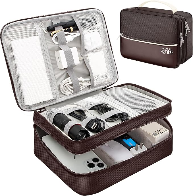 - DOUBLE LAYERS: The electronics bag is designed with 2 Layers interior compartment, the upper compartment can be used to organize Cable, Charger, Cellphone, Flash Drive, Earbuds, the lower compartment can store Adapter, Hard Drive, Power Bank, Tablet Computer. The front pocket provide a easier way to store your Cable, Cellphone or Power Bank.