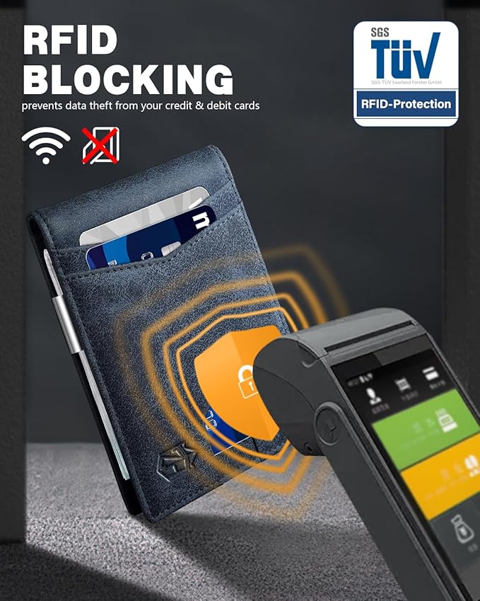 - CERTIFIED RFID SECURITY - Our card holder features German institute-certified RFID SECURE Technology, effectively blocking RFID signals at 13.56 MHz and above, safeguarding your chip-stored data from unauthorized scans