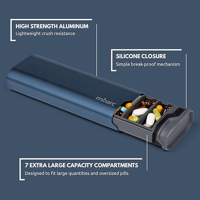 - STRONG AND EASY TO USE - Securely store your largest and smallest pills in their individual 7 daily containers in this unique medicine organizer. Opens with one hand, and when it is closed, it stays closed. Extremely strong. Go ahead, drop it, stand on it, ride your bike over it. The mbarc weekly pill case will outlast any other pill holder on the market and will look great in the process.