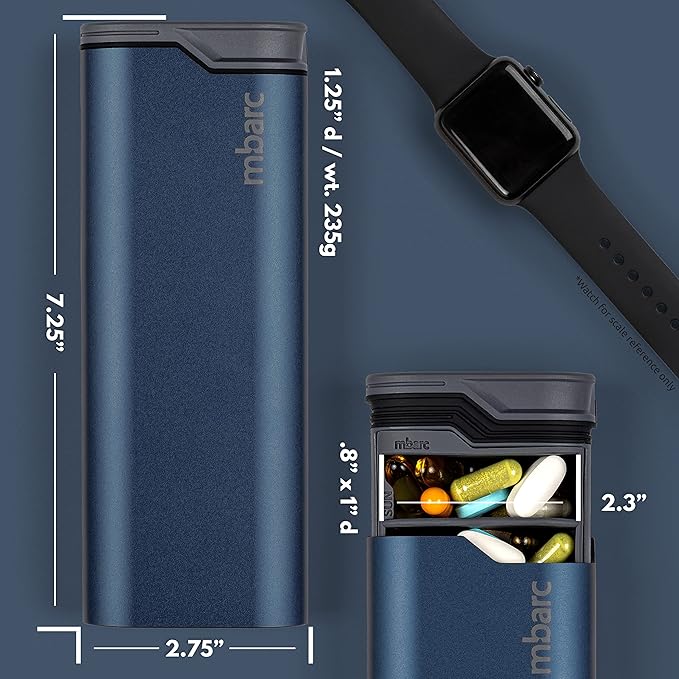 - PREMIUM MINIMALIST STYLE - The mbarc pill container is crafted from ultra-strong and light anodized aluminum tubing. It features a food safe silicone slide out pill tray that will safely and securely organize your pills. The clever silicone rib sealing mechanism means there are no plastic closure tabs to fail or break. Your pill case will turn heads as a modern and elegant pill container. For supplements, pills, vitamins and medicine- this is not your grandma’s pillbox.