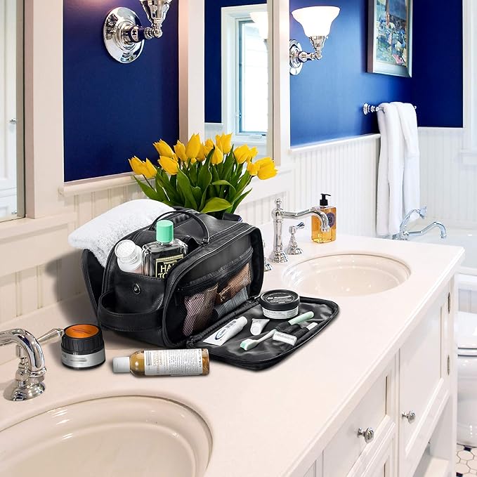 Elviros Toiletry Bag for Men, Large Travel Shaving Dopp Kit Water-resistant Bathroom Toiletries Organizer PU Leather Cosmetic Bags Fathers Day Gift(Medium, Black)