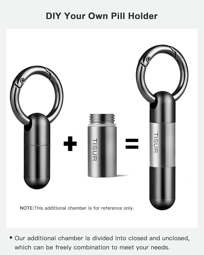 - What You Get: 1×TISUR Tiny Titanium Pill Holder Keychain+1×Quick Release Keyrings.