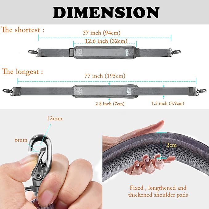 - Size: The padded shoulder strap can be adjusted between 37 inch to 77 inch (94 cm to 196 cm) in length, 1.5 inch in width. The length can be adjusted according to the user's needs. Long enough for cross-body use.