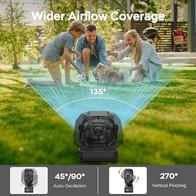 KITWLEMEN Camping Fan with Light - 20000mAh Rechargeable Battery Fan, 60Hrs Max Run Time, 4 Speeds, Timer, Auto Oscillation, 270° Pivot & Hook for Camping, Power Outage, Hurricane