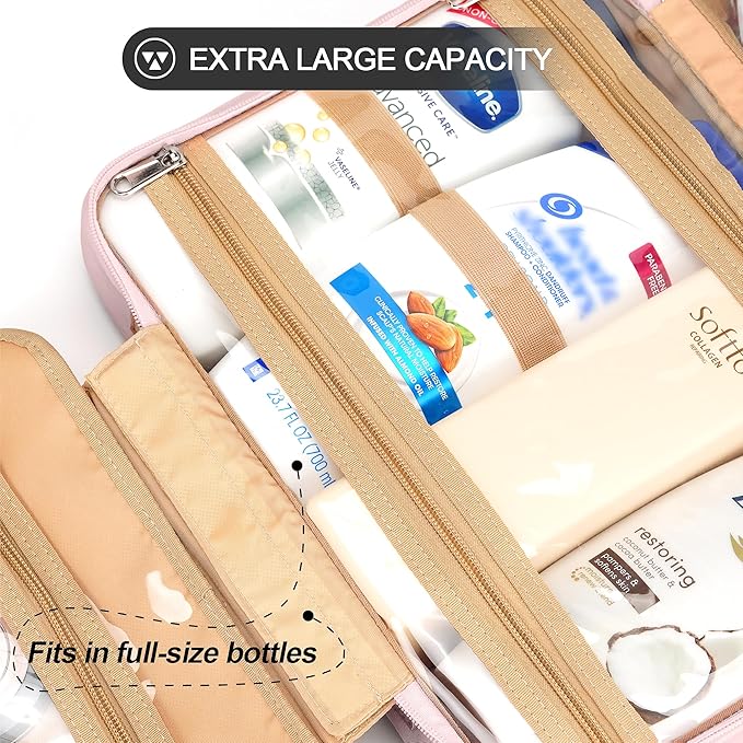Travel Hanging Toiletry Bag for Women, Extra Large Makeup Bag, Holds Full-Size Shampoo, with Jewelry Organizer Compartment, Waterproof Cosmetic Bag, Toiletries Kit Set with Trolley Belt, Baby Pink