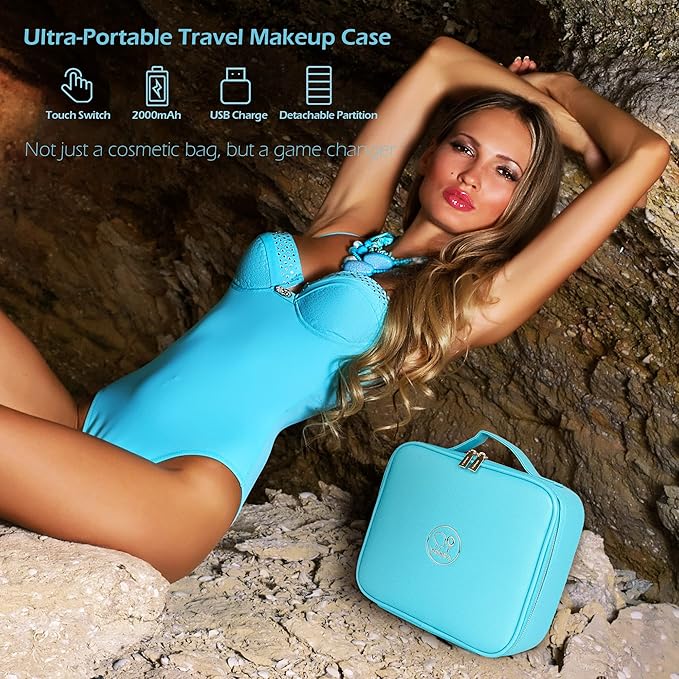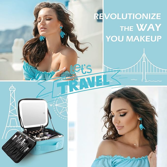MOMIRA Travel Makeup Bag Cosmetic Bag Makeup Organizer Bag with Lighted Mirror, Adjustable Brightness in 3 Color Scenarios, Waterproof Makeup Train Case, Gift for Women - Diamond Blue