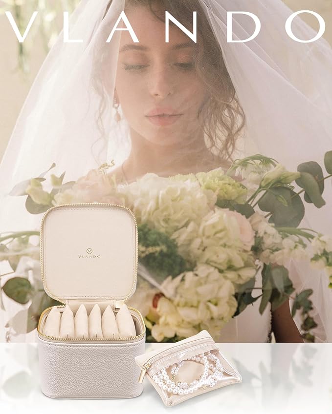 Vlando Travel Jewelry Case,Small Jewelry Box Organizer,Travel Jewelry Storage with 6 Velvet Jewelry Zipper Pockets, Birthday Gifts for Women Girls (White)