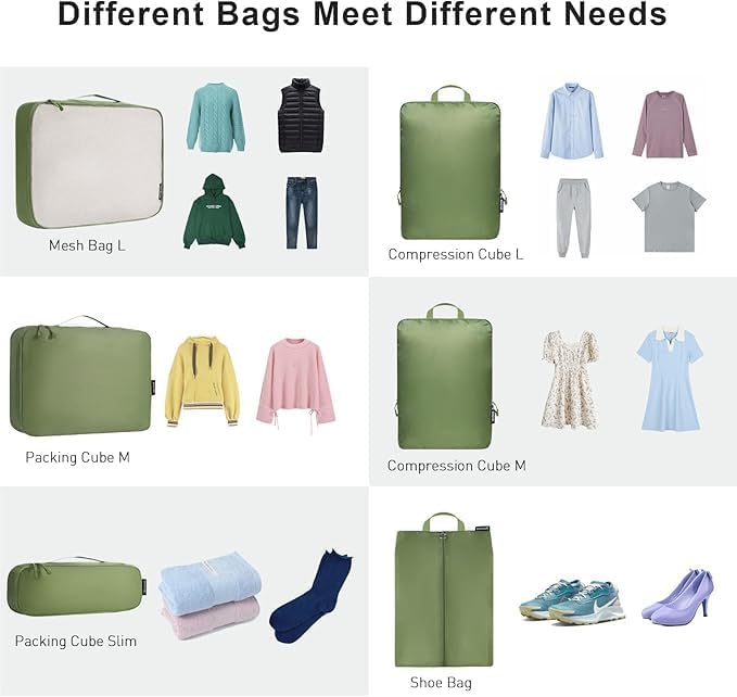 - Well Organized: We offer 3 regular and 3 compression packing cubes with 1 shoe bag to meet your different packing needs; Classifying and organizing your belongings for your travel will become easy with these ultralihgt packing organizers