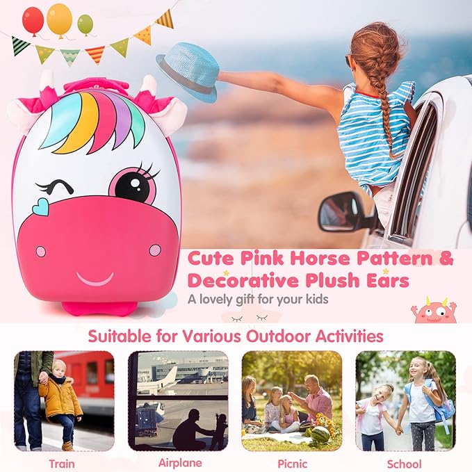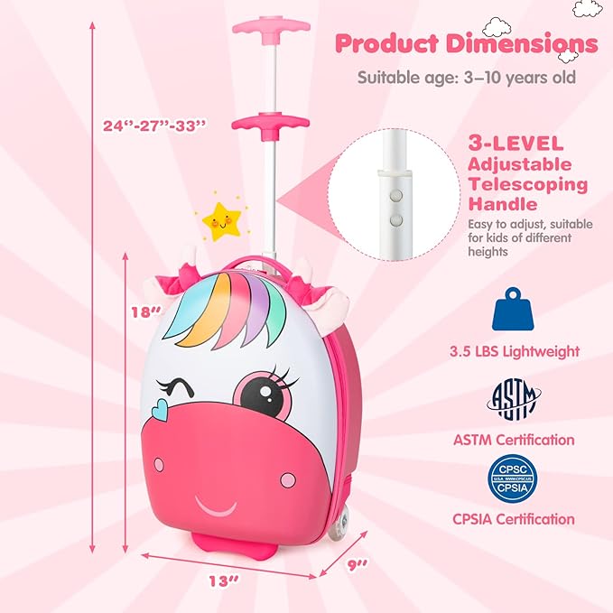 - 🎁【Waterproof & Scratch-proof Shell】 Made of non-toxic ABS, polycarbonate and nylon materials, this luggage is ASTM Certified to ensure children's safety and health. In addition, the hard shell can effectively be waterproof and scratch-proof to ensure long-lasting use for children.