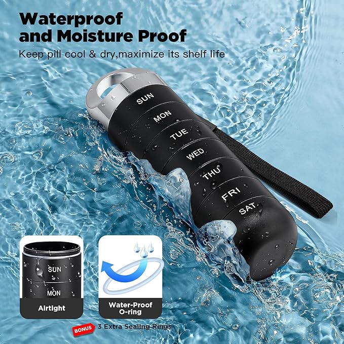 - Waterproof & Airtight: With waterproof rubber O-rings on each large pill organizer compartment, our pill container can protect your medicine from moisture and water, keep dry and cool, maximize their freshness and prolong their shelf life. Suitable for carrying out and daily home use in any weather. (including extra sealing rings)
