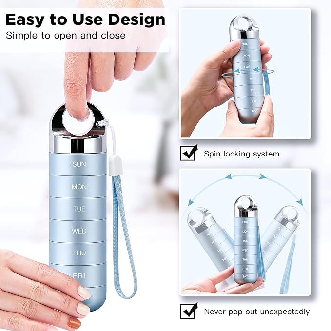 - Kids Friendly & Not Pop-up : Our stackable pill holder spin locking system can hold your pills firmly, never worry about the pill supplement organizer pop-up unexpectedly and pills rolling in your bag or pocket like other brands. Whatβs more, if your kids and naughty pets (such as parrot, cat, dog) notice your pill boxes, there is no way they can get into your pills.