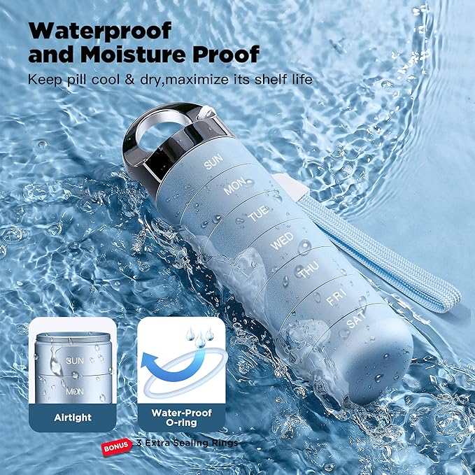 - Waterproof & Airtight: With waterproof rubber O-rings on each large pill organizer compartment, our pill container can protect your medicine from moisture and water, keep dry and cool, maximize their freshness and prolong their shelf life. Suitable for carrying out and daily home use in any weather. (including extra sealing rings)