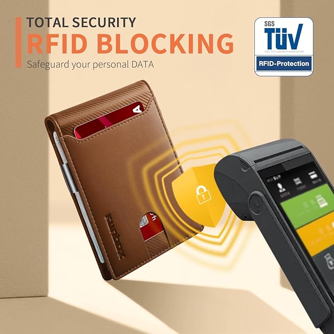 - 𝐑𝐅𝐈𝐃 𝐀𝐧𝐭𝐢-𝐓𝐡𝐞𝐟𝐭 𝐒𝐄𝐂𝐔𝐑𝐈𝐓𝐘 - this slim wallet for men equipped with German Instiute Certified RFID Security technology, a unique metal composite, engineered specifically to block 13.56 MHz or higher RFID signals to protect the valuable information and privacy