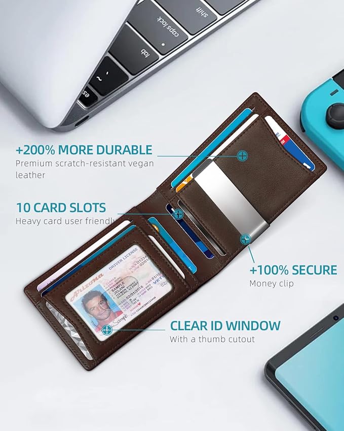 - Money Clip Design - Measuring 4" x 3.5", this slim men's wallet boasts a money clip structure that occupies less space than traditional bill compartments, effectively minimizing bulk. It includes 11 card slots: a quick-access slot on the front, 10 regular slots on the inner card sleeves, and an integrated dedicated AirTag pocket. (AirTag not included)