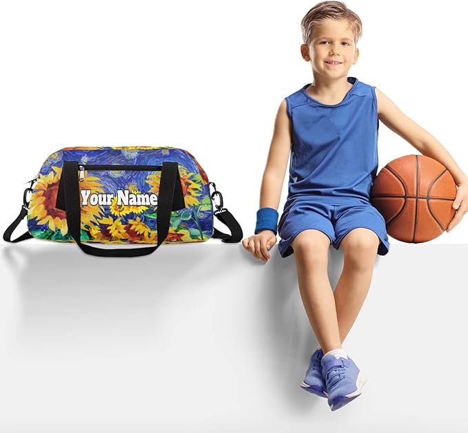 Custom Your Name Oil Painting Sunflower Personalized Text Gym Duffle Bag for Kids,Sports Bag for Teens Boys & Girls Small Waterproof Overnight Weekender Carry School Practice Travel Bag