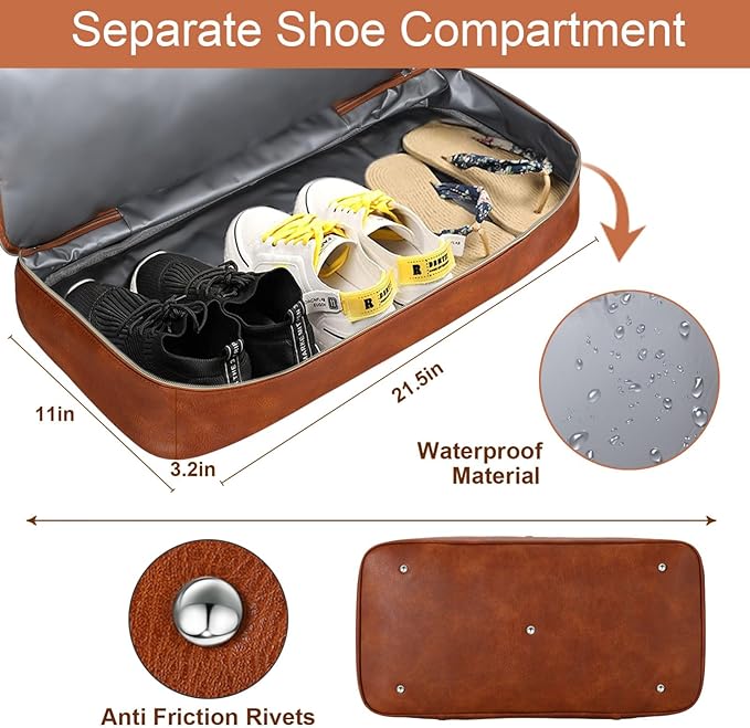 - Waterproof Separate Shoe Compartment: The shoes compartment of this travel duffle bag is fashioned with PVC waterproof materials to facilitate carrying your shoes during travel. This compartment can also be used to hold dirty clothes or wet towels, separating wet and dry to prevent your clean luggage from getting soiled or wet. Shoes compartment size: 21"Lx11"W*3.2"H and can fit up to 3 pairs of shoes. The thicker bottom can better carry weight.