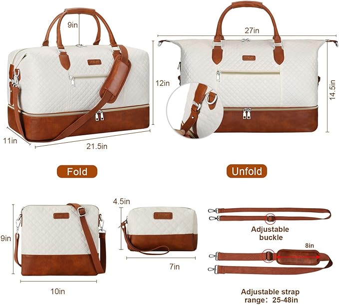 - Large Capacity Weekender Bag: Overnight bag for women: 21.5"L×11"W×12"H, spacious to pack 3-4 days worth of daily essentials such as clothes, pants, footwear, cosmetics, toiletries, electronic equipment, can hold up to 21" laptop, crossbody bag: 10"L×9"H, toiletry bag: 7"L×4.5"H. Two adjustable straps(thin+wide) range: 25"-48". The wide strap have a comfortable padding, which can reduce the pressure when carrying. You can wear it as a cross-body bag, shoulder bag or handbag.