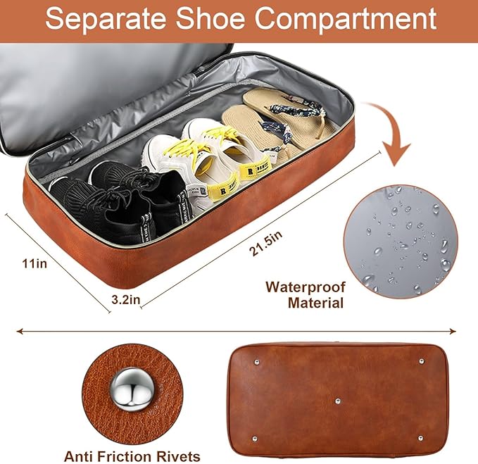 - Waterproof Separate Shoe Compartment: The shoes compartment of this travel duffle bag is fashioned with PVC waterproof materials to facilitate carrying your shoes during travel. This compartment can also be used to hold dirty clothes or wet towels, separating wet and dry to prevent your clean luggage from getting soiled or wet. Shoes compartment size: 21"Lx11"W*3.2"H and can fit up to 3 pairs of shoes. The thicker bottom can better carry weight.