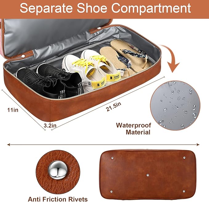 - Waterproof Separate Shoe Compartment: The shoes compartment of this travel duffle bag is fashioned with PVC waterproof materials to facilitate carrying your shoes during travel. This compartment can also be used to hold dirty clothes or wet towels, separating wet and dry to prevent your clean luggage from getting soiled or wet. Shoes compartment size: 21"Lx11"W*3.2"H and can fit up to 3 pairs of shoes. The thicker bottom can better carry weight.