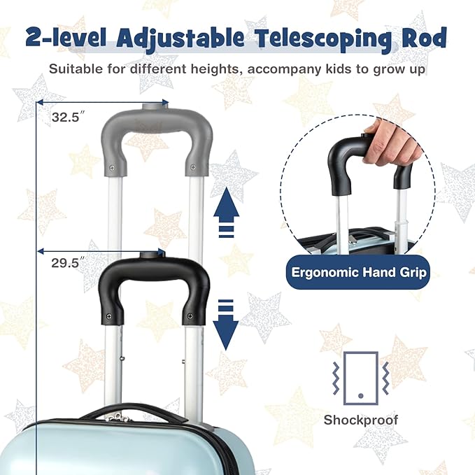 - đăRetractable Handle & 4 Spinner Wheelsă Locking telescopic handle with multi-level adjustment makes it easy for kids of different heights to pull along. The widened shoulder strap on the backpack can reduce the pressure on kidsâ shoulders and can be adjusted to suit the kidsâ bodies. Four universal wheels make it easy for children to be flexible and effortless to move.
