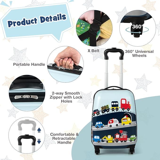 - đ€©ă2 PCS Carry On Luggage Setă The kid luggage set includes a 16ââ hardshell suitcase and a 12ââ backpack, providing a large capacity to keep items well organized. The suitcase features inside cross straps and a zippered storage pocket for classifying items, and the backpack also comes with 2 storage compartments. Moreover, the luggage set is airline-approved to carry on.