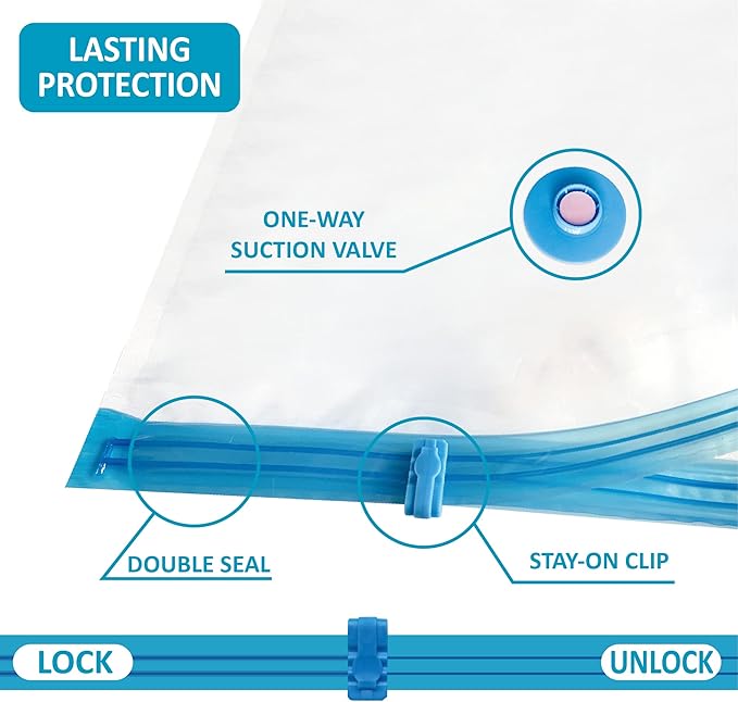 - Reliable protection: With the triple-seal turbo valve & double-zip seal design, our vacuum bags get the air out in the suction process. Can be used repeatedly.