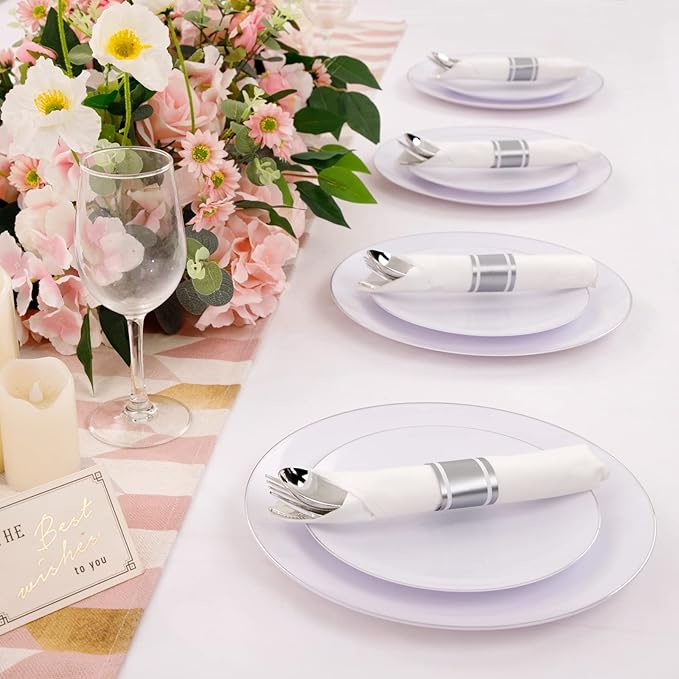 - 【VALUE PACKAGING】Why not make your next gathering an unforgettable experience with our plastic silver silverware? The disposable silver cutlery include 30 forks,30 knives,30 spoons,30 napkins,offering a complete table setting solution.